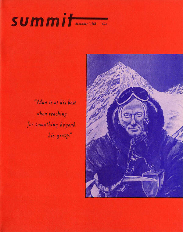 A fine art print of the cover of Summit's December 1963 issue. All prints are produced on acid-free papers using archival inks to guarantee that they last a lifetime without fading or loss of color. All prints include a 1" white border around the image to allow for future framing and matting, if desired.
